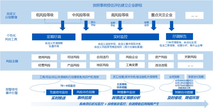 而新推出的“启信宝”客商版·应收账款管理套件,包括启信分、合同违约指数、隐形关系挖掘、黑名单穿透、一键风险扫描等板块,能助力客商合作前、中、后全链路风险管理能力升级,包括合作前授信体系搭建、合作中账期风险批量监测与实时预警、合作后挖掘欠款去向,从而一方面将账款风险控制在最前端,一方面实时监测账期异动,变被动为主动防范。
