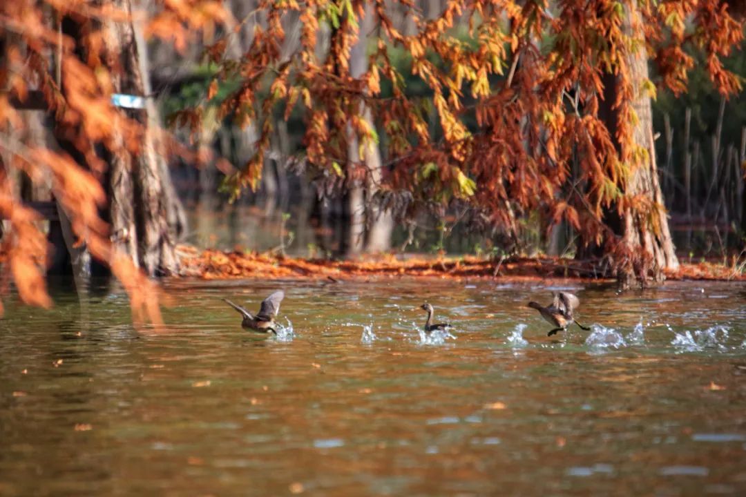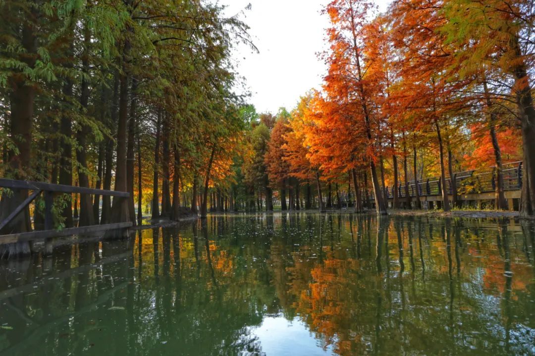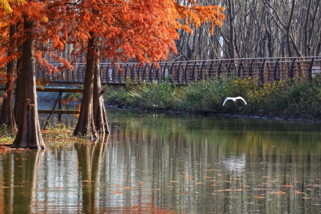 紧邻明珠湖的西沙湿地,这几天正进入层林尽染的季节。乘船徜徉在湿地2000多米长的水森林景观河道上,岸边的池杉、落羽杉、柳树呈现出明黄、橙红、浅绿等不同的色彩,宛如打翻了大自然五彩斑斓的调色盘。