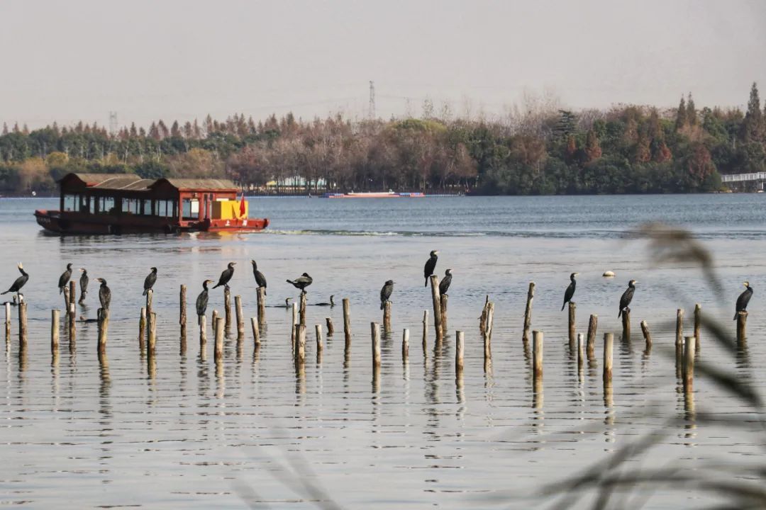 这几天,来到明珠湖边的游客如果运气够好,就有可能在湖中的栖木桩上看到大批刚刚“落地”的野鸬鹚,它们来自千里之外的北方。