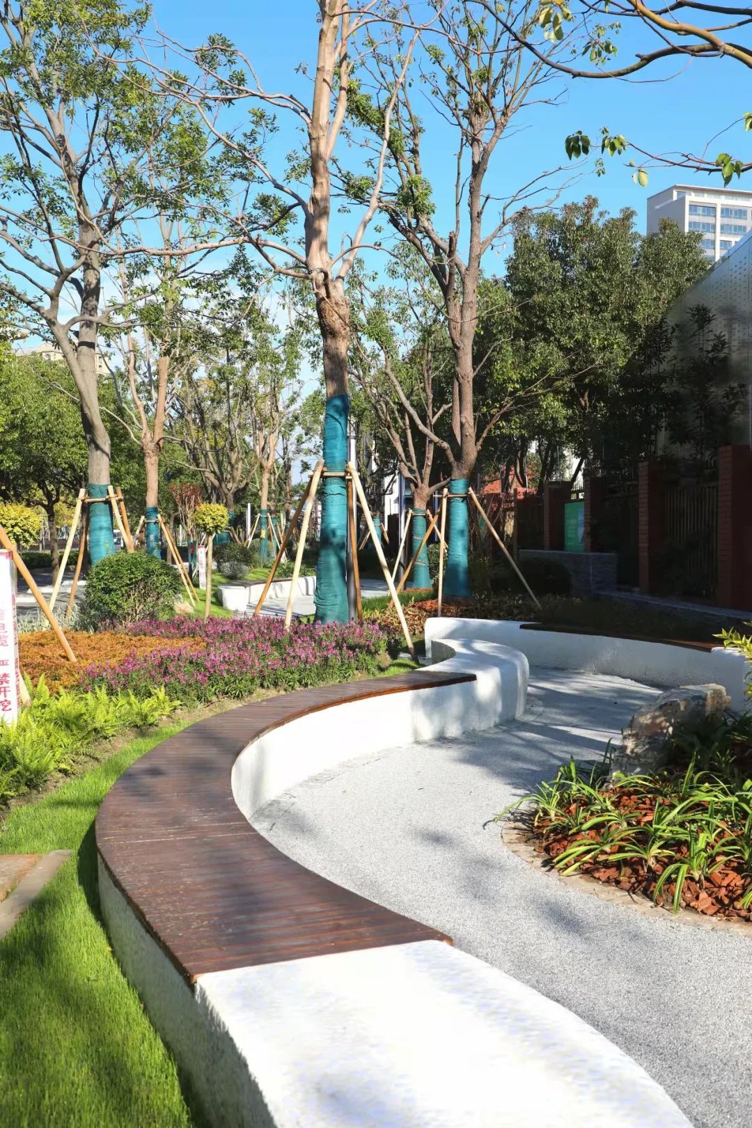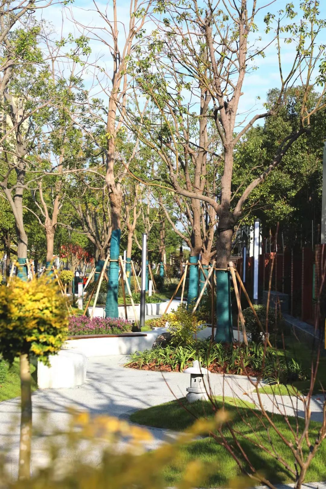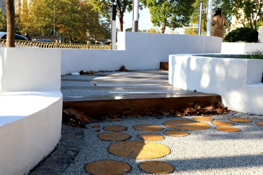 本次社区公园的改造提升,设计方充分利用了现有地形,调整了原有乔木的分布,增加了色叶大乔和开花类植物,通过色彩斑斓的树叶和五颜六色的花带,增添了花园的活力。