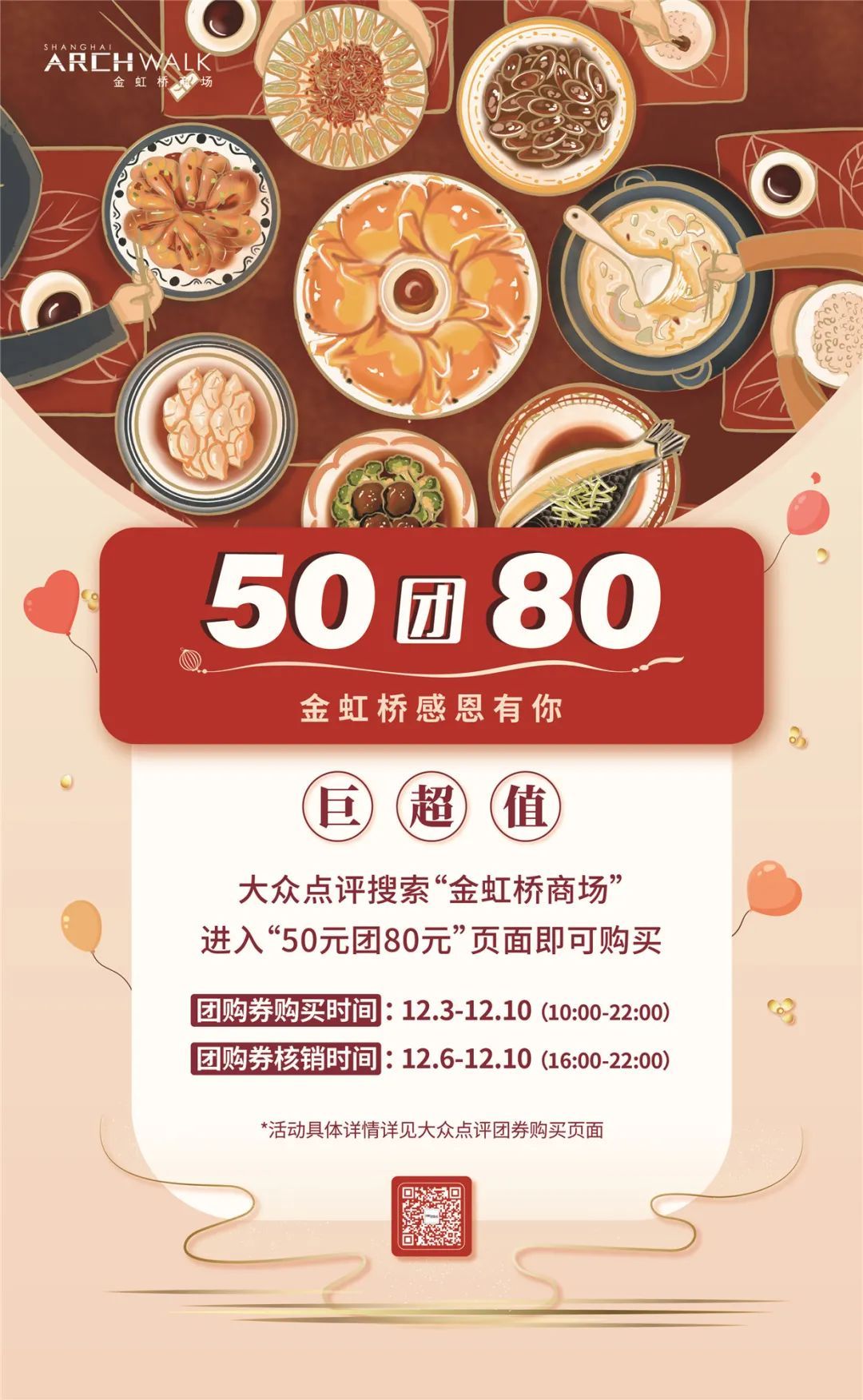 金虹桥商场将推出“感恩有你”超值团购券活动,12月3日至10日,在大众点评搜索“金虹桥商场”,点击“50元团80元”页面即可购买,数量有限,先到先得。团购券使用时间为12月6日至12月10日,使用规则详见大众点评。