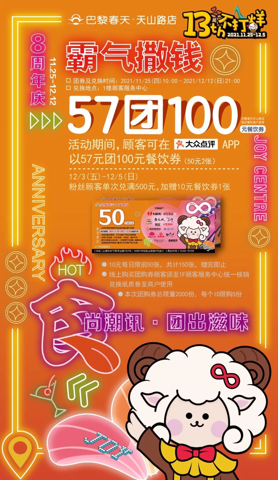 同时,巴黎春天天山路店在大众点评上线了“57元团100元”餐饮券,可在15家商户中使用,先到先得,具体使用规则详见大众点评及商户店内告示。