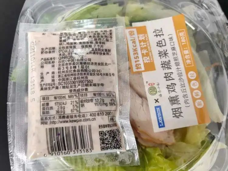 老北京风味鸡肉卷沙拉的总能量约200千卡/份,烟熏鸡肉蔬菜色拉约144千卡/份,健身达人藜麦饭之虾仁减脂版约649千卡/份,蛋白多多鸡胸热能碗约666千卡/份。四款样品中,有两款样品实测能量超过600千卡/份。