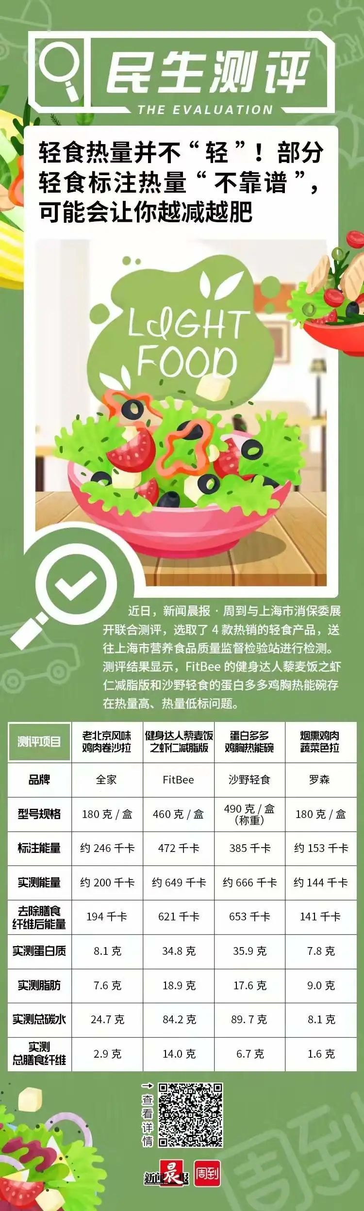 近日,上海市消保委与新闻晨报·周到围绕轻食热量和健康问题展开联合测评,选取了4款热销的轻食产品,送往上海源本食品质量检验有限公司(上海市营养食品质量监督检验站)进行检测。