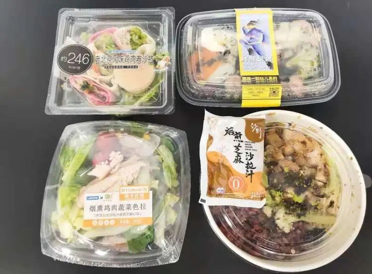 记者分别在便利店和外卖平台购买了2款轻食,分别为全家的老北京风味鸡肉卷沙拉、罗森的烟熏鸡肉蔬菜色拉、FitBee的健身达人藜麦饭之虾仁减脂版、沙野轻食的蛋白多多鸡胸热能碗。