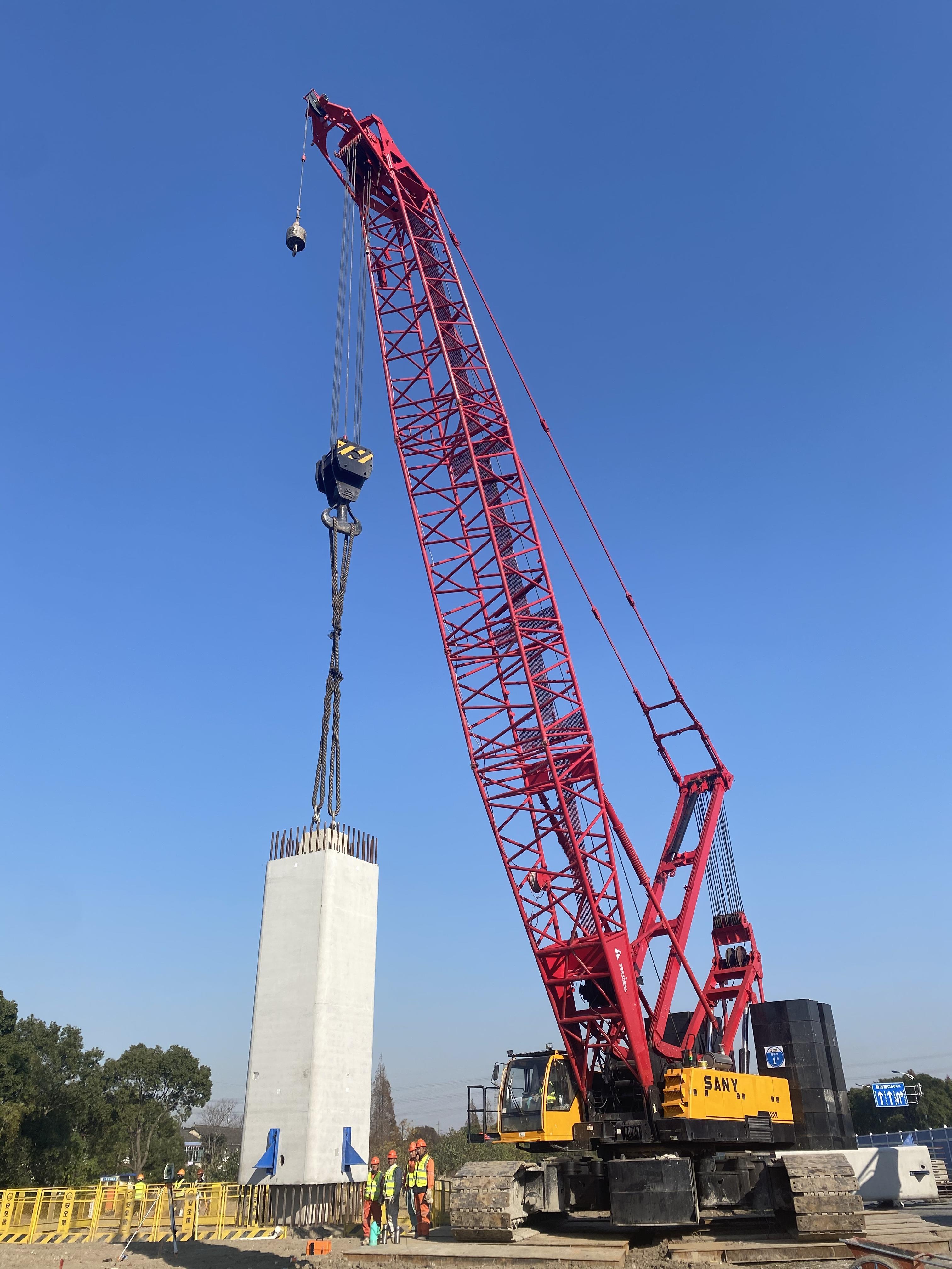 上海公路桥梁(集团)有限公司项目负责人李铭劼 解释道:“超高性能混凝土也就是使用高强度的填充物来填充整个接头的位置,使接头的强度更高,性能和质量也更能得到保证。通过这一项技术,整个工程的时间大大缩短,立柱施工方面,现在一天可以吊到四根,之后熟练操作后,可以做到一天六根。”