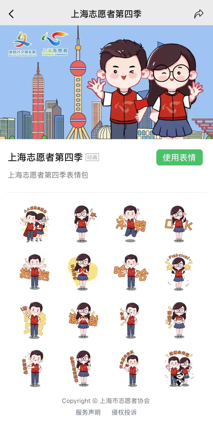 微信中的【我】-【表情】-搜索【上海志愿者】即可找到最新一季表情包。