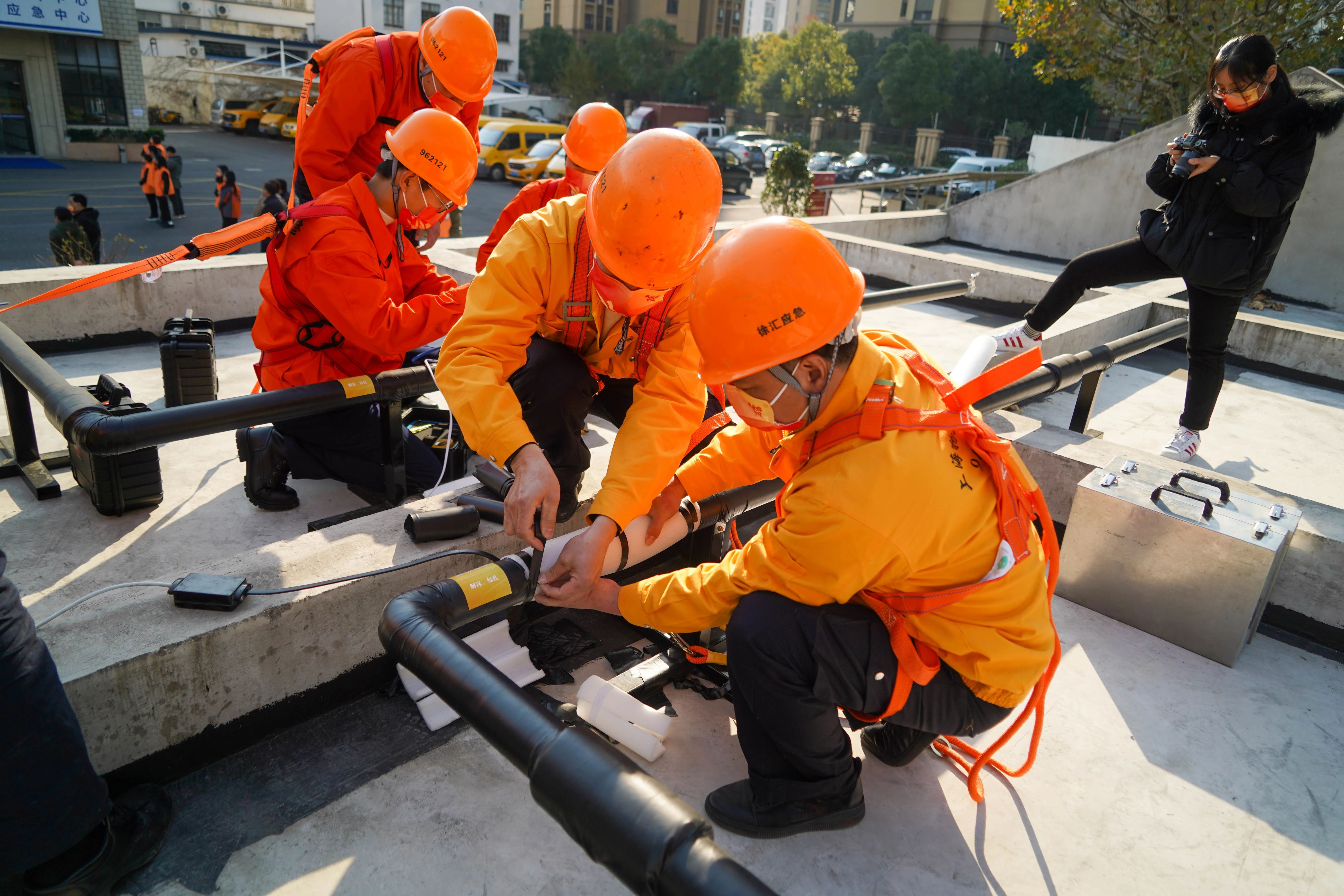 揭牌活动后,来自全市10家房屋维修应急中心的队伍还参加了2021年上海市住宅小区房屋维修应对雨雪冰冻灾害应急演练。演练通过指挥中心、发单应用、抢单模块、单兵系统等的运用,提升了各支队伍应对雨雪冰冻自然灾害应急处置能力。