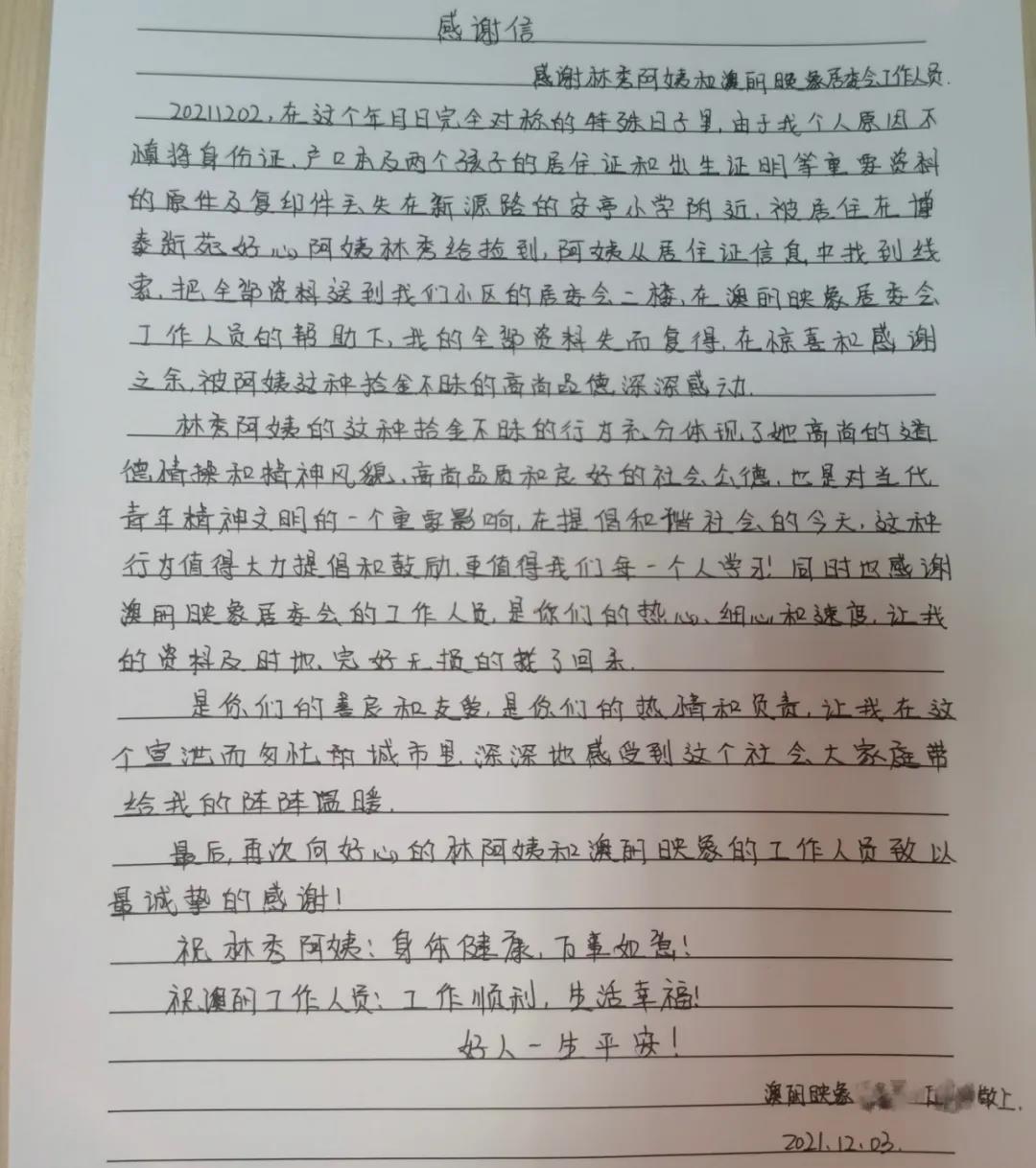 “全部资料失而复得,在惊喜和感谢之余,也被好心阿姨的高尚品德深深感动……在这个喧嚣而匆忙的城市里,我感受到了平凡的好心人带给我的温暖……”日前,安亭镇博泰新苑小区居民林秀收到了这样一封情真意切的感谢信。