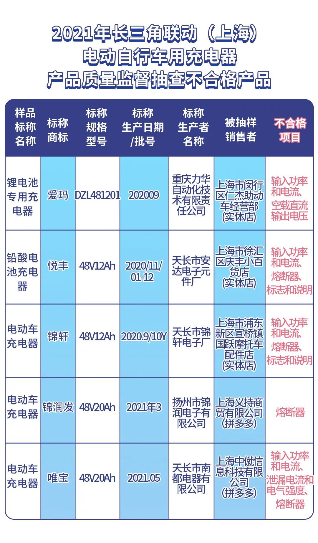市市场监管局对本市生产、销售的电动自行车、电动自行车用充电器和电动自行车锂离子电池55批次产品进行了产品质量监督抽查,共发现不合格产品9批次。其中电动自行车20批次中3批次不合格,电动自行车用充电器25批次中5批次不合格,电动自行车锂离子电池10批次中1批次不合格。详见↓