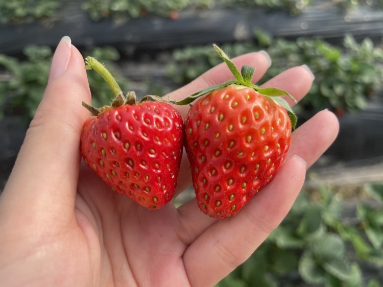 周国朝告诉记者,合作社的草莓园目前共种植了约50亩草莓,以“章姬”“红颜”两个品种为主,也就是市民口中的“奶油草莓”和“巧克力草莓”。其中,“章姬”果实健壮,色泽鲜艳光亮,口感软糯香甜,闻起来有淡淡奶香味;而“红颜”则质地偏硬,吃上去酸酸甜甜,完全成熟后呈暗红色。