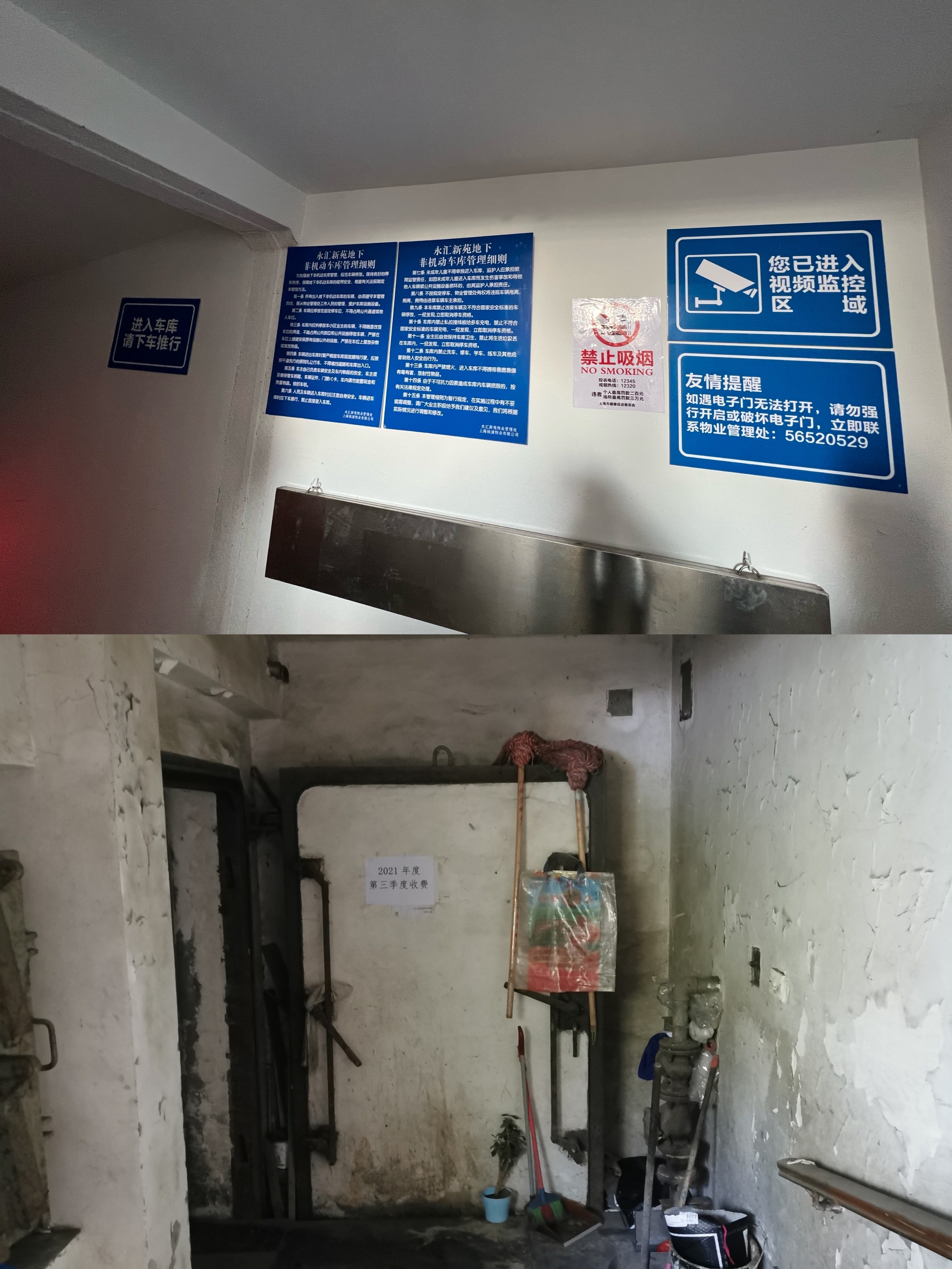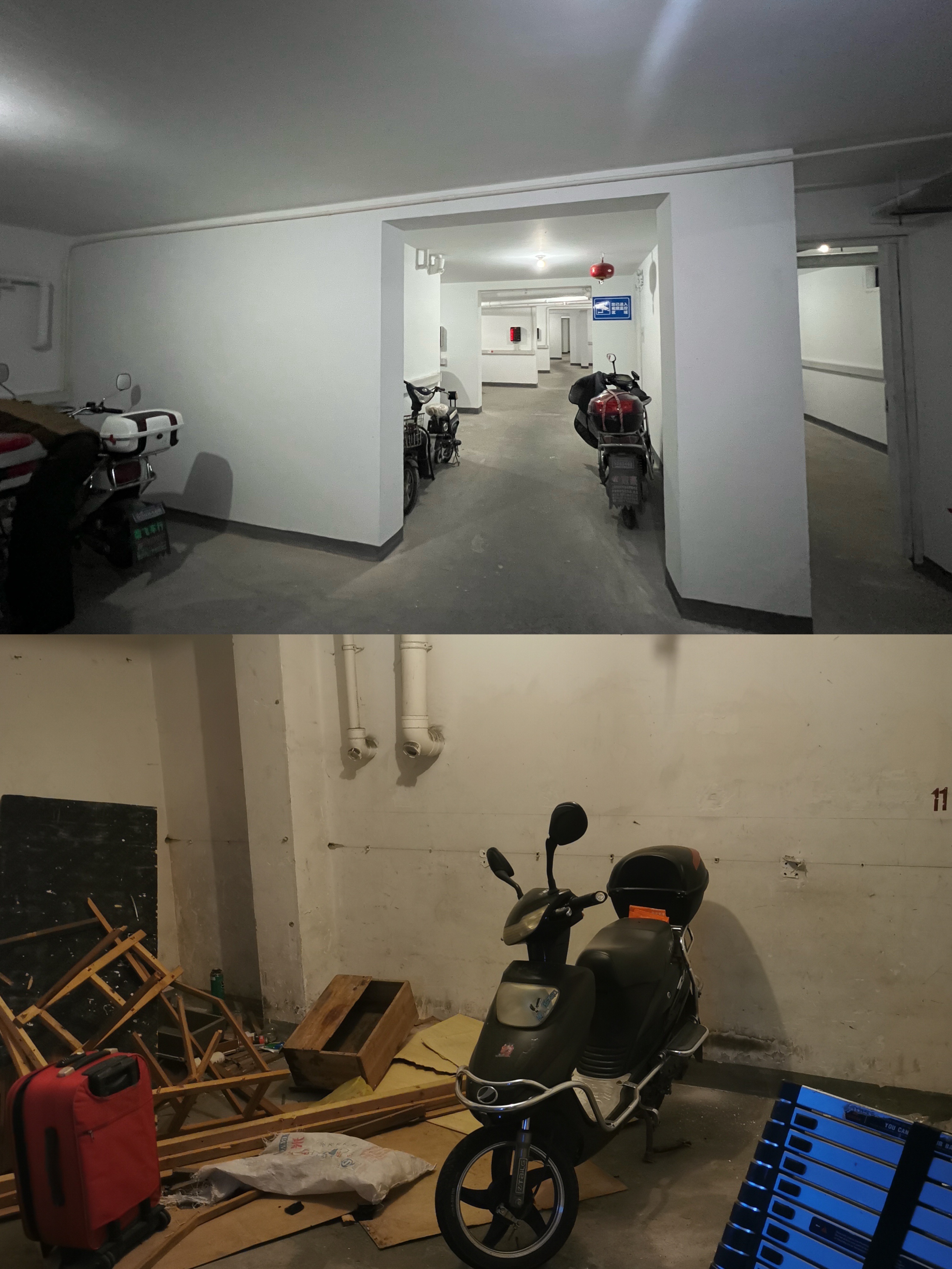 地下非机动车库改造前后对比(上图:改造后 下图:改造前)