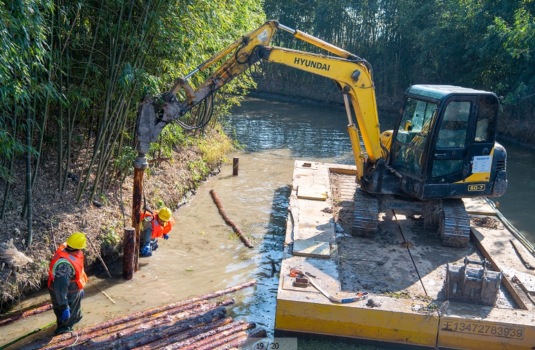 为了避免施工过程中对附近的房屋结构产生影响,施工人员已用木桩对河岸进行了加固。此外,还将通过新建护岸、种植斜坡绿化与水生植物等方式,让村民居住环境和水环境都能得到明显改善。
