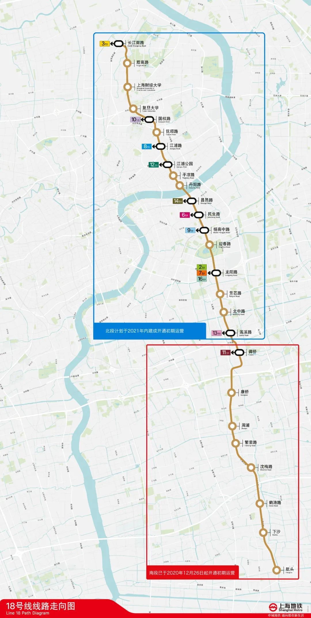 本次计划开通初期运营的18号线一期工程北段,起自南段御桥站,止于长江南路站,途经浦东新区、杨浦区、宝山区,设车站18座,其中9座车站可与12条城市轨道交通线路形成换乘。此前,18号线一期工程南段(航头站至御桥站)已于2020年年底开通初期运营。