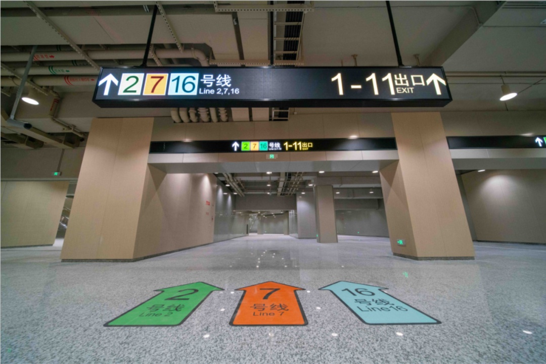龙阳路换乘枢纽现状包含4条轨道交通线路(2、7、16号线和磁浮线),在18号线一期北段开通后将形成超大规模的“五线换乘”枢纽。在确保既有线不停运的前提下,通过2、7、16、18号线逆时针单向循环的总体换乘思路,短时高效地完成了工程结构、设备系统的改造和装修,提升了龙阳路换乘枢纽的客流集散能力。