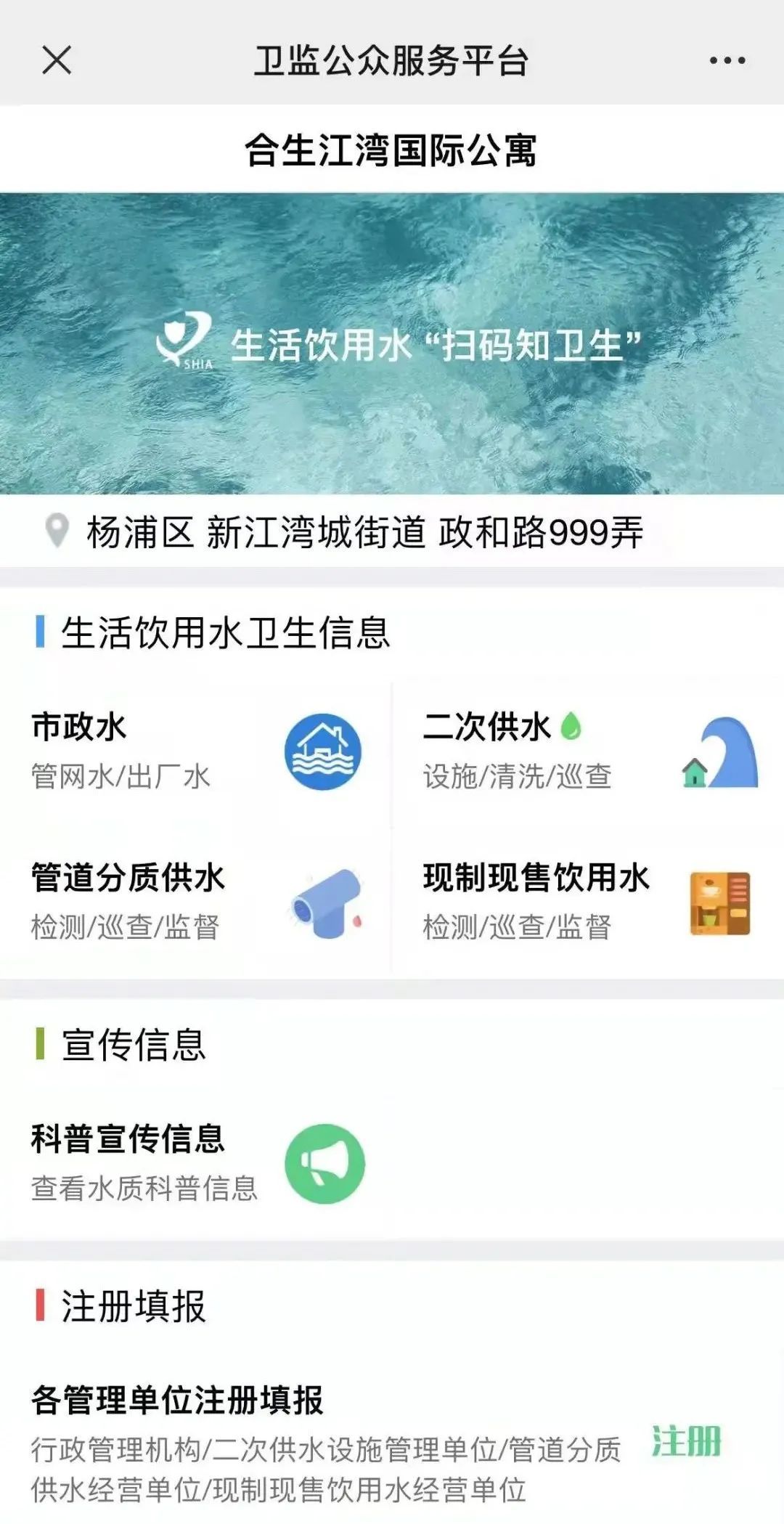 生活饮用水“扫码知卫生”工作是健康上海行动的第一批民生项目。手机扫一扫小区里的上海市生活饮用水“扫码知卫生”二维码标牌,就能查看生活饮用水的卫生信息、宣传科普信息等。
