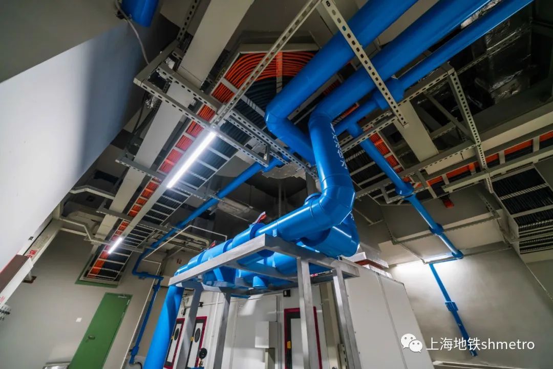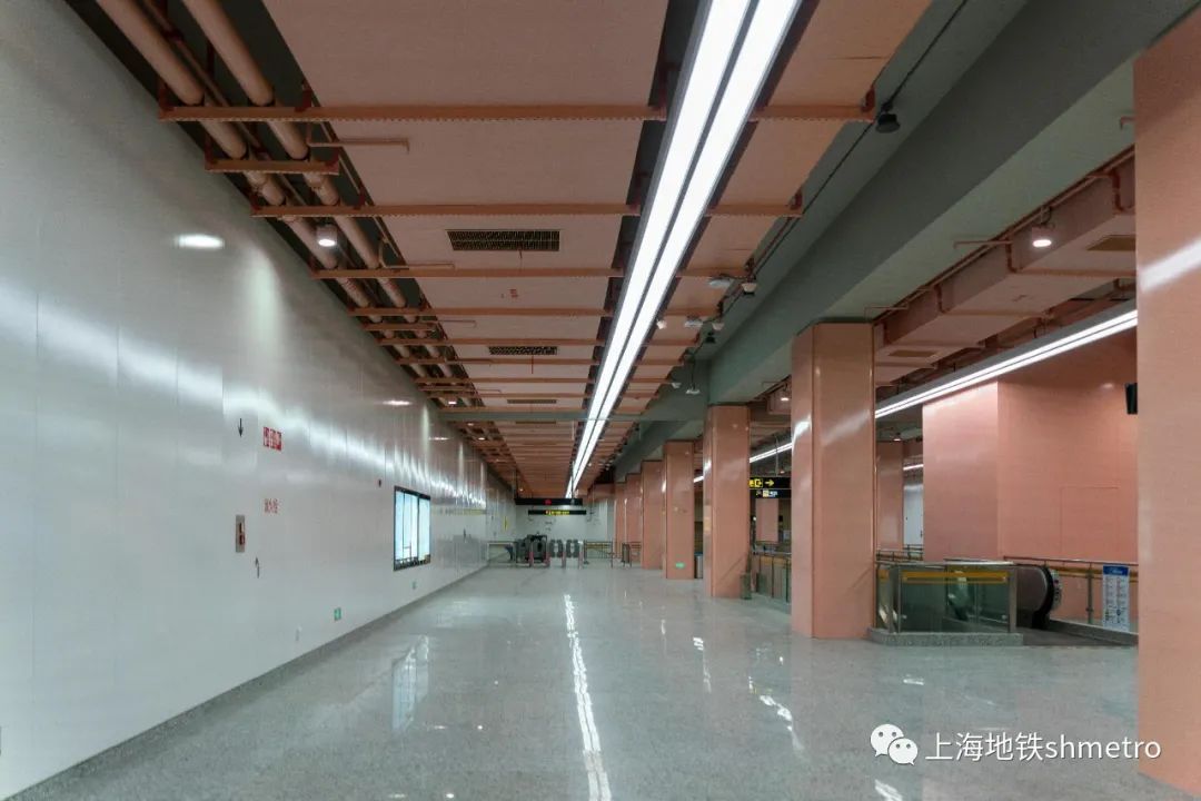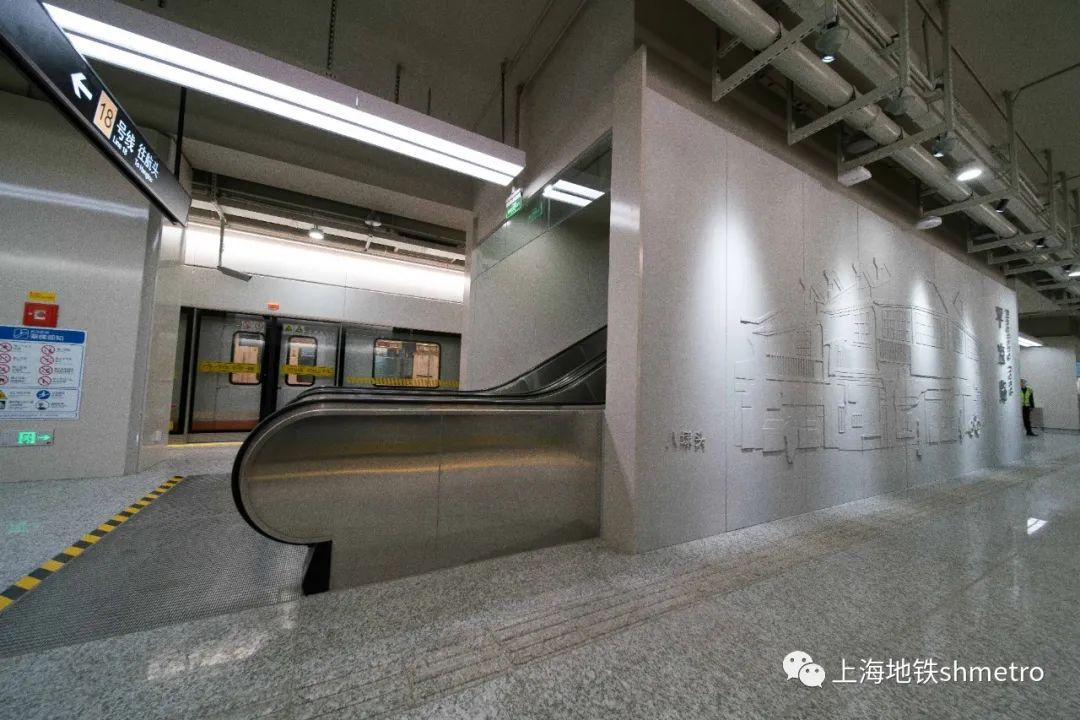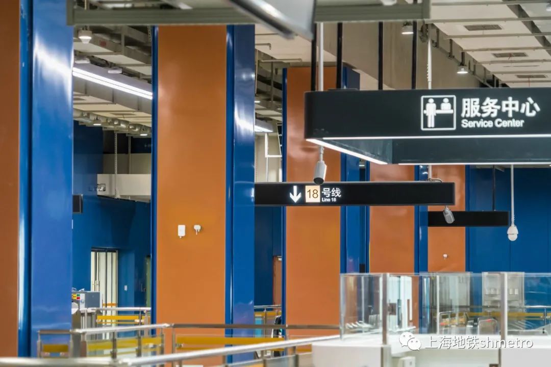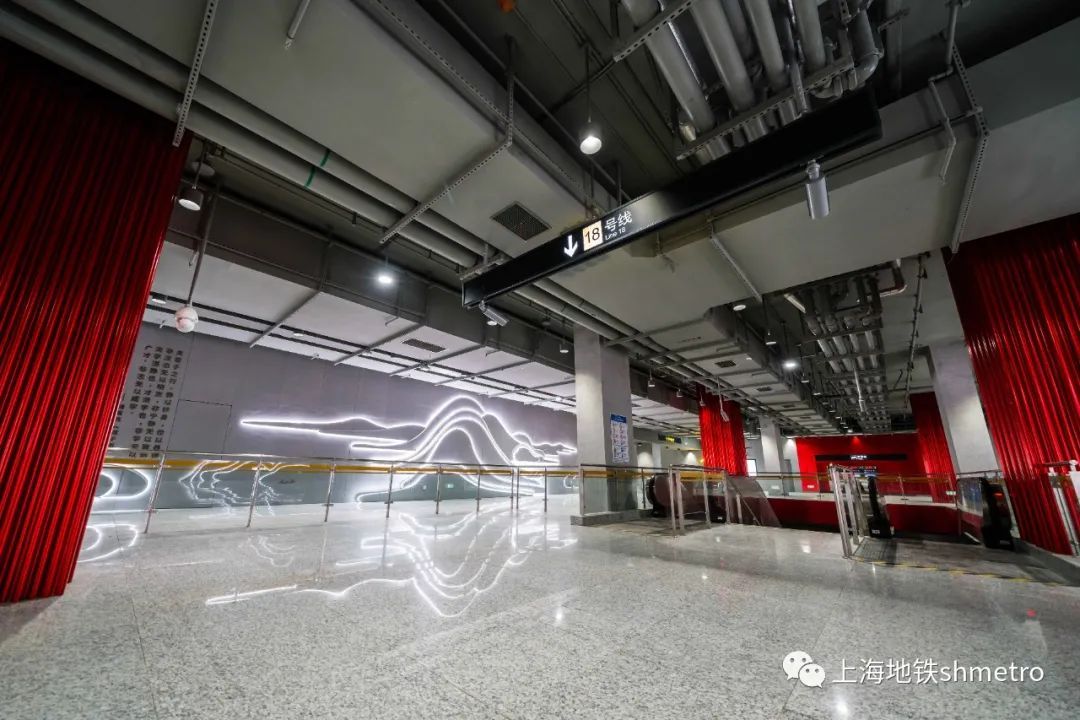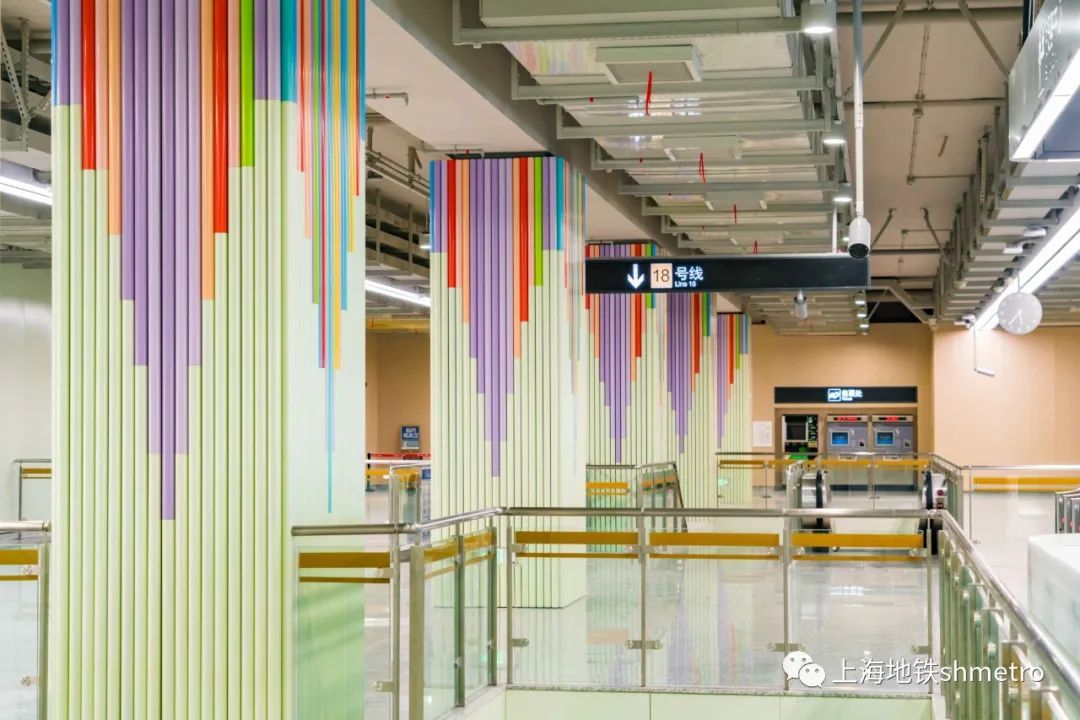 18号线以“功能融合装饰”为原则,全线取消了车站的吊顶,采用露出车站结构板和各类管线的裸装风格,墙面及立柱采用整块的大尺度面板装饰,视觉上更凸显空间的景深效果。墙面、柱面、和顶部管线,通过特别设计的色彩的搭配,突出各种构件的视觉性,传递现代、简约、明快的工业美感。建造中特别对上部各类管线桥架的尺度和走向进行整体把控,使管线和桥架本身也成为装饰体系的一部分。车站公共区域部位,集约统筹各类管线布设,空间高度提升达1.5米,车站空间舒适度大幅提高。