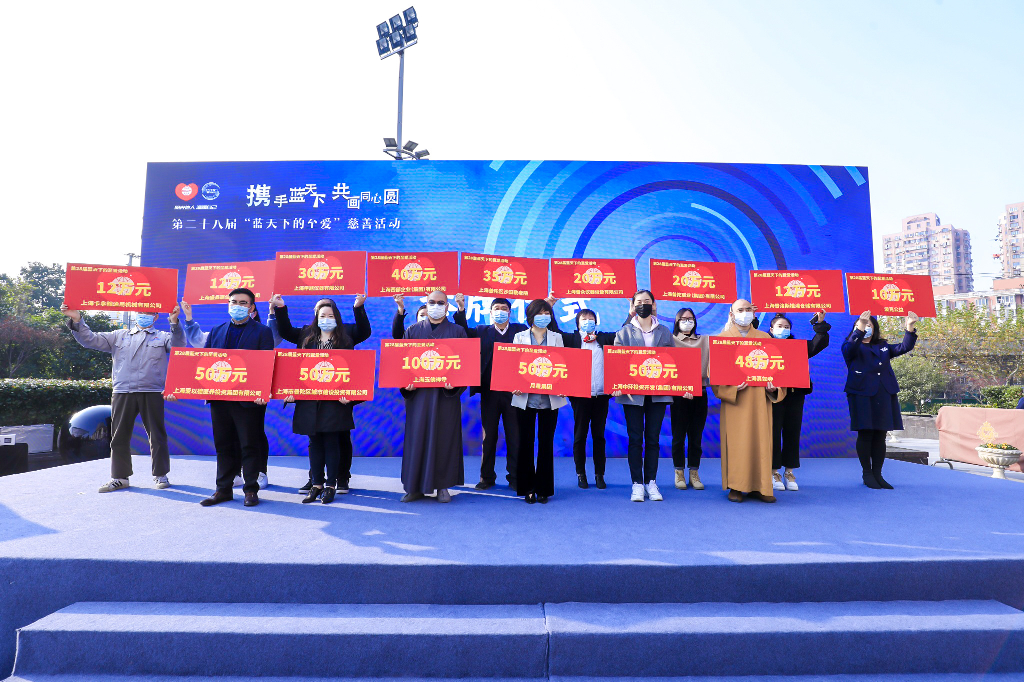 上海玉佛禅寺、月星集团、上海市普陀区城市建设投资有限公司、上海中环投资开发(集团)有限公司、上海爱以德医养投资集团有限公司、上海真如寺、上海西部企业(集团)有限公司、上海普陀区沙田敬老院、上海申旭仪器有限公司、上海晋众仪器设备有限公司、上海普陀商业(集团)有限公司、上海普洛斯槎浦仓储有限公司、上海盛鑫建设工程有限公司、上海卡拿翰通用机械有限公司、波克公益等15家普陀区爱心企业、社会组织现场举牌捐款,奉献爱心。与会人员一同观看了普陀慈善公益宣传片《携手蓝天下》。