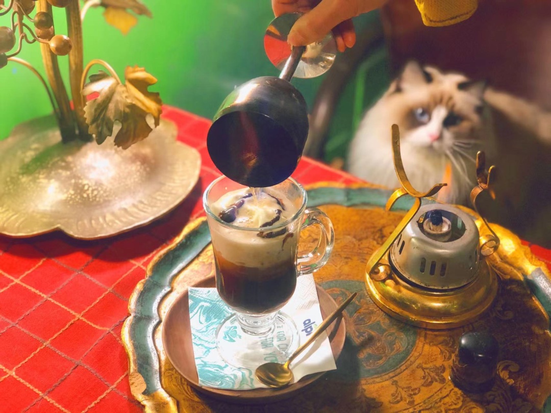 一家店、两只猫,调着自己喜欢的咖啡,挑着自己喜欢的家具、音乐、饰品,静候着不期而至的有缘人。弄堂深处,一个不是你特意去寻,便将有极大可能会错过的咖啡小店,已然在南昌66号扎根了十几年,见证着周边许多“网红”咖啡店的兴起、退场。整个小店遍布着红与绿的撞色,“撞”出了一份别致的高级感。诚然,个性化是这家店的标签。那些复古的装饰品也大多都是店主王姐夫妇从八方淘来,自带时间的温度。特制的爱尔兰咖啡是店中特色。