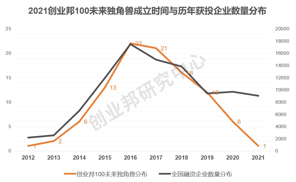 独角兽或未来独角兽的孕育与中国创投市场的发展息息相关,创投市场的冷暖与创业者的创业决策、创业公司的成长存在很强的相关性。创业邦睿兽分析的数据显示,2016年中国一级股权投资市场的热度达到顶峰,获投企业数(种子轮至Pre-IPO)创下高峰,随后创投市场的热度逐步下降。100家未来独角兽成立的时间印证了中国创投市场的趋势,2016年成立的企业最多,达到22家,随后稳步下降。