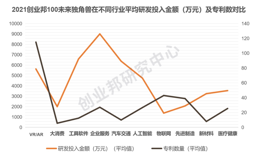 从研发投入平均值和专利数的平均值比较来看,各行业研发投入与获得的专利数之间存在一定的相关性。其中,企业服务、汽车交通、人工智能、新材料、医疗健康领域未来独角兽企业当前的研发投入较高,专利数相对其他行业却不占据优势,显示相关领域的未来独角兽处在加大研发投入的阶段;而VR/AR、物联网等领域未来独角兽研发投入相对偏低,但获得的专利数相比其他领域占有一定优势,显示相关行业处在研发成果加速商业化落地的阶段。