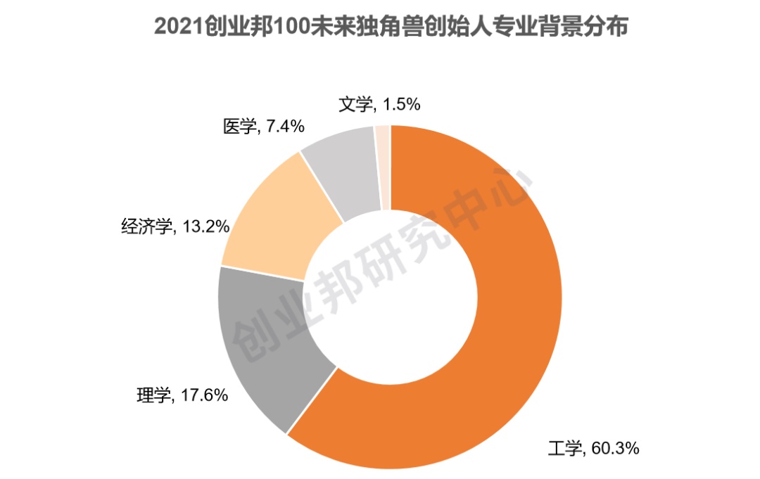 从创始人所学专业来看,77.9%毕业于理工科,13.2%毕业于经济学,7.4%毕业于医学,1.5%毕业于文学,其中理工类中主要以计算机、人工智能、自动化、生物化学和物理化学专业为主,大量技术类专业毕业生进入创业领域,使未来独角兽企业更具有技术驱动的特征。
