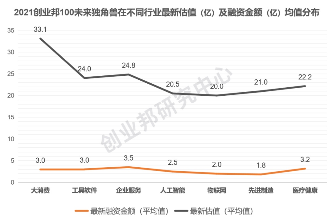 调研数据显示,有93家未来独角兽企业在2021年披露过新融资,占比超过90%。从统计结果来看,创业邦100未来独角兽总估值超过2300亿元,平均估值约为23亿元,有67%的未来独角兽估值集中在10~30亿元,其中大消费、企业服务、工具软件、医疗健康等行业平均估值相对较高,皆超过20亿元。由于本次入围的100家未来独角兽平均成立时间为4.17年,未来拥有广阔的增长空间。