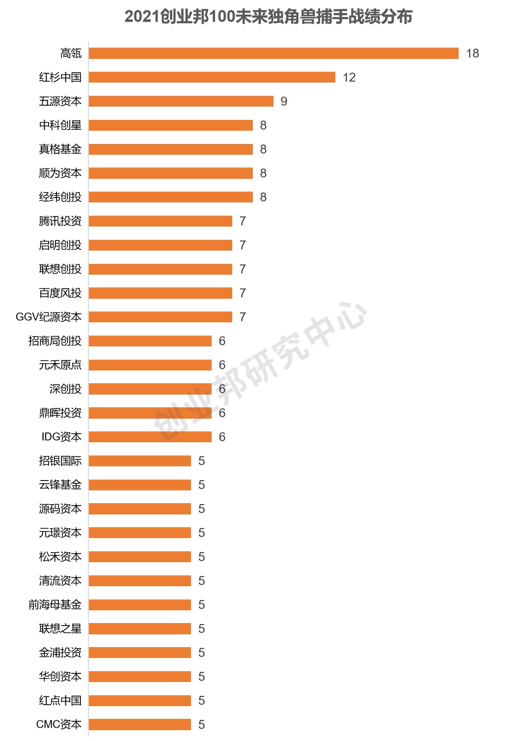 此外,近年来随着中国CVC的快速崛起,CVC投资的项目也迅速成长,已经跻身独角兽或未来独角兽行业。在100家未来独角兽中,可以看到联想创投、百度风投、招商局创投的身影,其投资未来独角兽100企业的案例数分别达到7起、7起和6起。
