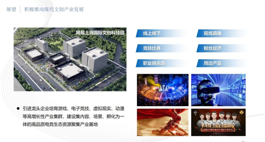 依托网易上海国际文创科技园,赵巷镇引进龙头企业培育游戏、电子竞技、虚拟现实、动漫等高增长性产业集群,建设集内容、场景、孵化为一体的高品质电竞生态资源聚集产业基地,探索打造特色电子竞技小镇,形成涵盖线上线下、竞技比赛、职业俱乐部、现场直播、粉丝经济和周边产品的全产业链发展模式,助力上海“世界电子竞技之都”建设。