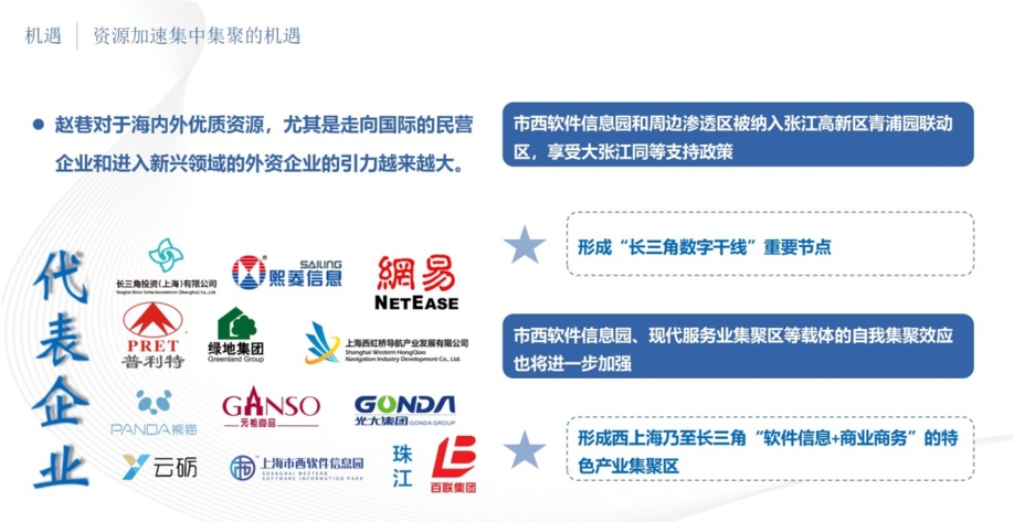 其次是资源加速集中集聚的机遇。在两大国家战略加持下,赵巷的虹吸效应不断加大,对于海内外优质资源,尤其是走向国际的民营企业和进入新兴领域的外资企业的引力越来越大。随着市西软件信息园以及一批重大产业项目的落地建设,特别是市西软件信息园和周边渗透区被纳入张江高新区青浦园联动区,享受大张江同等支持政策,形成“长三角数字干线”重要节点。加快促成“软件信息+商业商务”的特色产业集聚区,已入驻一批优质企业,比如,网易、奥莱、元祖、绿地等。