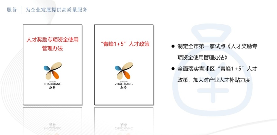 人才政策方面,为了加大人才服务力度,作为镇一级,赵巷镇在全市第一家试点出台《人才奖励专项资金使用管理办法》,全面落实青浦区“青峰1+5”人才政策,加大对产业人才补贴力度。