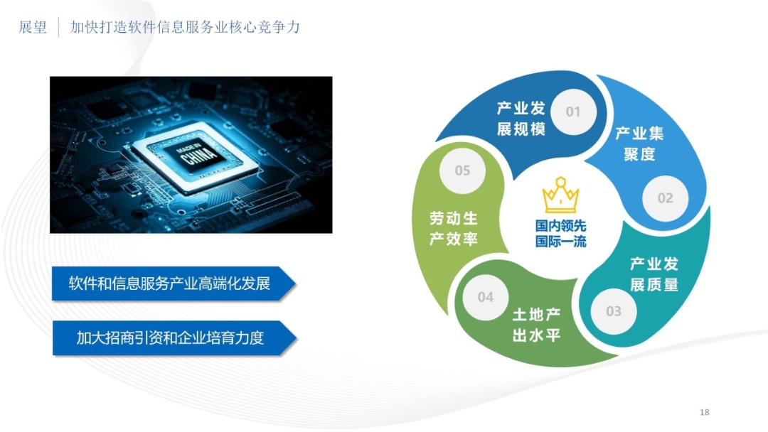 推进软件和信息服务产业向高端化方向发展,加大招商引资和企业培育力度,稳步提高园区软件和信息服务产业发展规模、产业集聚度、产业发展质量、土地产出水平、劳动生产效率等指标,达到国内领先、国际一流水平。