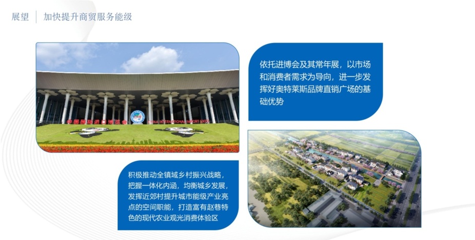 二是商贸服务产业。赵巷镇依托进博会及其常年展,以市场和消费者需求为导向,引导企业优化和拓展业态结构、经营模式、品牌层次,提升时尚品牌消费能级和休闲购物体验,积极争取扩大离境退税“即买即退”商店数量,继续保持奥莱在行业中的领跑地位。积极推动全镇域乡村振兴战略,把握一体化内涵,均衡城乡发展,发挥近郊村提升城市能级产业亮点的空间职能,打造富有赵巷特色的现代农业观光消费体验区。
