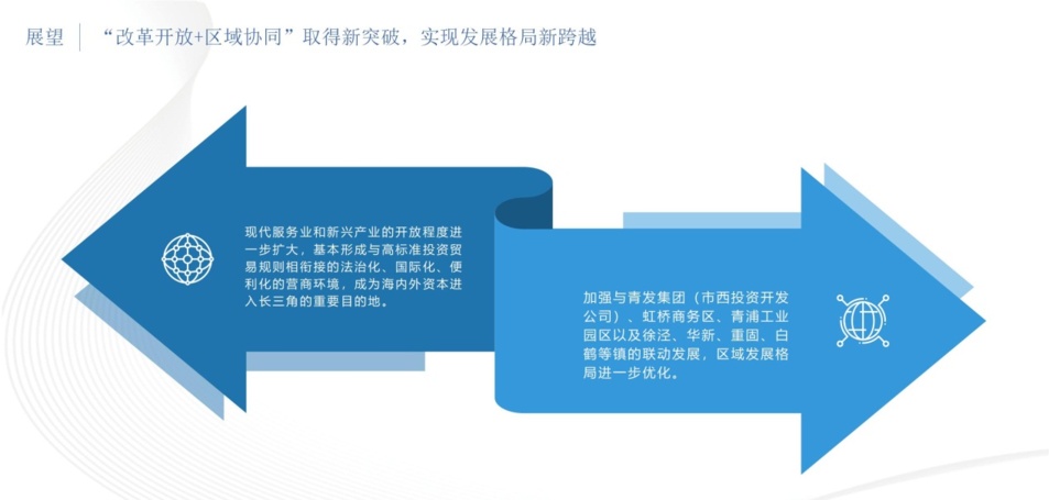 二是“扩大开放+区域协同”取得新突破,实现发展格局新跨越。现代服务业和新兴产业的开放程度进一步扩大,基本形成与高标准投资贸易规则相衔接的法治化、国际化、便利化的营商环境,成为海内外资本进入长三角的重要目的地。加强与青发集团(市西投资开发公司)、西虹桥公司、淀山湖新城公司、青浦工业园区等区级公司以及徐泾、华新、重固、白鹤等镇的联动发展,区域发展格局进一步优化。