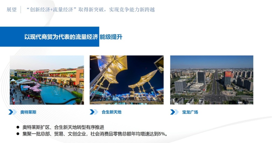一是“创新经济+流量经济”取得新突破,实现竞争能级新跨越。以软件信息为代表的创新经济形成集聚,市西软件信息园以及赵巷科技绿洲、网易、北斗等重点项目建成运营,“十四五”期末总建筑面积将达到400万平方米,产值突破1500亿元、占全市的比重超过10%,提供就业岗位15万个,率先落地一批智慧应用场景。以现代商贸为代表的流量经济能级提升,奥特莱斯扩区、合生新天地转型抓紧推进,集聚一批总部、贸易、文创企业,社会消费品零售总额年均增速达到5%。