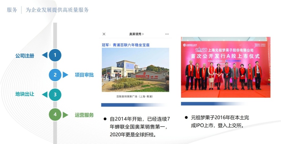 赵巷镇始终把优化营商环境,打造“服务高地”作为经济社会发展的内生最强驱动力。首先是为企业发展提供高质量服务。赵巷有镇属公司――新城公司、品牌公司、商投公司、置业公司负责招商引资与服务,全程无缝对接企业发展中的公司注册、项目审批、地块出让、运营服务等。多年来,不管是注册型还是实地型企业,都在赵巷得到了良好的发展。百联奥特莱斯自2014年开始,已经连续7年蝉联全国奥莱销售第一,2020年更是全球折桂。元祖梦果子2016年成功IPO,登陆上交所。