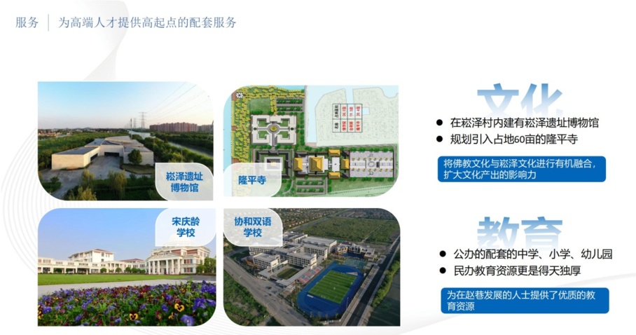 三是为高端人才提供高起点的配套服务。赵巷传承有距今约6000年的崧泽文化,在崧泽村内建有崧泽遗址博物馆。上海“第一人”“第一房”“第一稻”都诞生在崧泽遗址中。紧邻着崧泽遗址,将规划引入占地超过60亩的隆平寺和上海佛学院,将佛教文化与崧泽文化进行有机融合,扩大文化产出的影响力,这一区域将成为青浦、上海乃至长三角的“文化高地”。同时,赵巷拥有优质的教育资源,除优质的公办学校外,民办教育资源更是得天独厚,宋庆龄学校、协和双语学校等十二年一贯制民办优质学校,满足在赵巷落户人才的多样化教育需求。