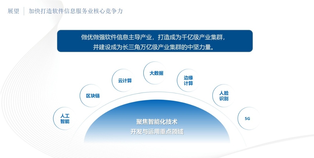 一是软件信息产业。围绕“东有张江、西有赵巷”目标,做优做强软件信息主导产业,打造千亿级产业集群,并建设成为长三角万亿级产业集群的中坚力量。聚焦人工智能、区块链、云计算、大数据、边缘计算、人脸识别和5G为代表的智能化技术开发与运用的重点领域。