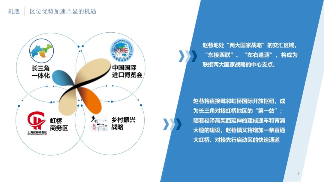 随着四个国家战略的深入推进,赵巷正迎来前所未有的历史机遇期,黄金发展期。首先是区位优势加速凸显的机遇。赵巷地处进博会和长三角一体化两大国家战略的交汇区域,“东接西联”“左右逢源”,将成为联接两大国家战略的中心支点。