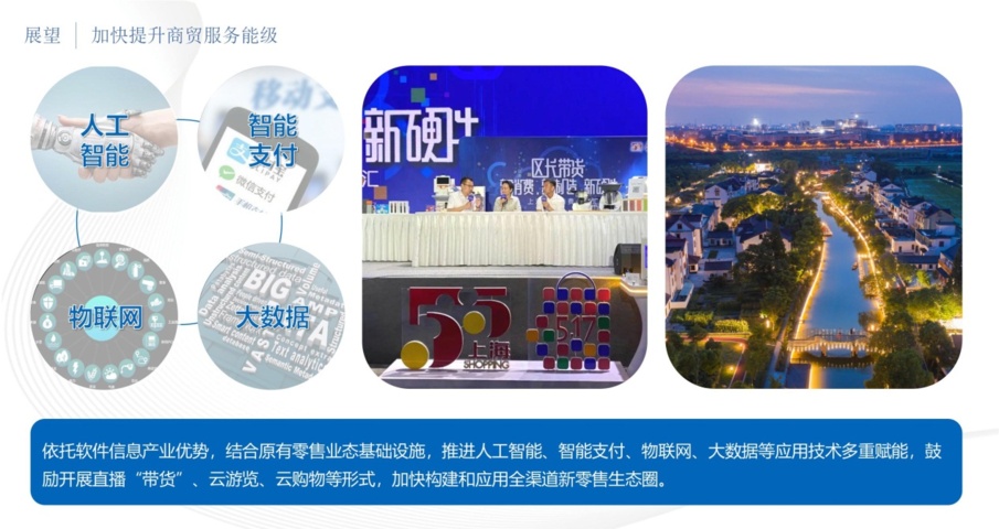 依托软件信息产业优势,结合原有零售业态基础设施,赵巷镇推进人工智能、智能支付、物联网、大数据等应用技术多重赋能,鼓励开展直播“带货”、云游览、云购物等形式,加快构建和应用全渠道新零售生态圈。