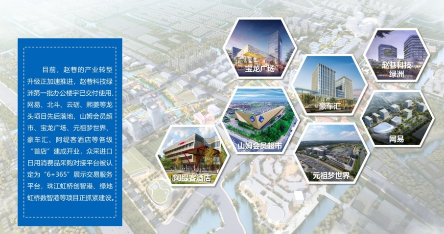 目前,赵巷的产业转型升级正加速推进,赵巷科技绿洲第一批办公楼宇已交付使用,网易、北斗、云砺、熙菱等龙头项目先后落地,山姆会员超市、宝龙广场、元祖梦世界、豪车汇、阿缇客酒店等各级“首店”建成开业,众采进口日用消费品采购对接平台被认定为“6+365”展示交易服务平台,珠江虹桥创智港、绿地虹桥数智港等项目正抓紧建设。