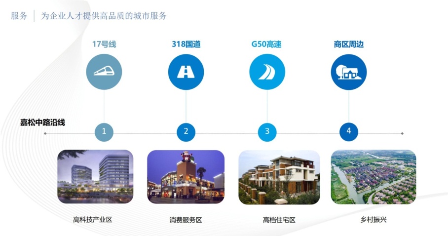 其次是为企业人才提供高品质的城市服务。嘉松中路沿线已形成了初具雏形的产城融合效应,轨交17号线沿线两侧是以长三角赵巷科技绿洲、网易为代表的高科技产业区。318国道周边是以奥特莱斯、元祖梦果子为代表的消费服务区。G50沪渝高速以南是成片环境优美的高档住宅区。商区周边,乡村振兴建设也加速推进中,和睦村完成第三批上海市乡村振兴示范村建设,引入了红豆集团等优质社会资本打造和睦水街,融入商区整体发展,提升亮色,拓展服务维度。同时,赵巷全面推进“一网统管”“三大整治”、美丽街区等社会治理工作,为企业发展和人才居住,塑造干净、整洁、有序的城市面貌。