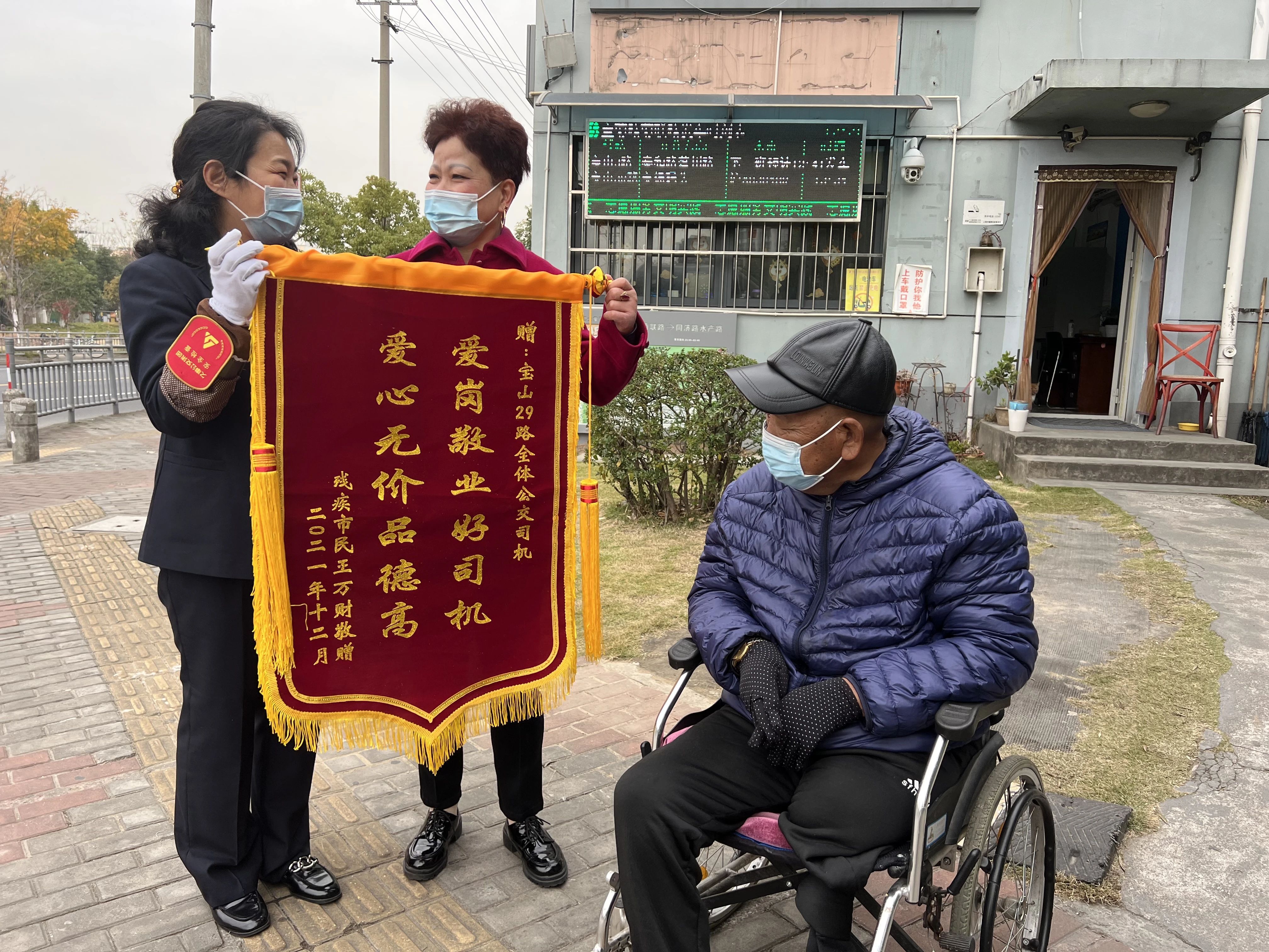 12月9日下午,韩阿姨拿着一面绣着“爱岗敬业好司机,爱心无价品德高”的锦旗,来到巴士五公司十车队宝山29路宝菊路菊联路终点站。