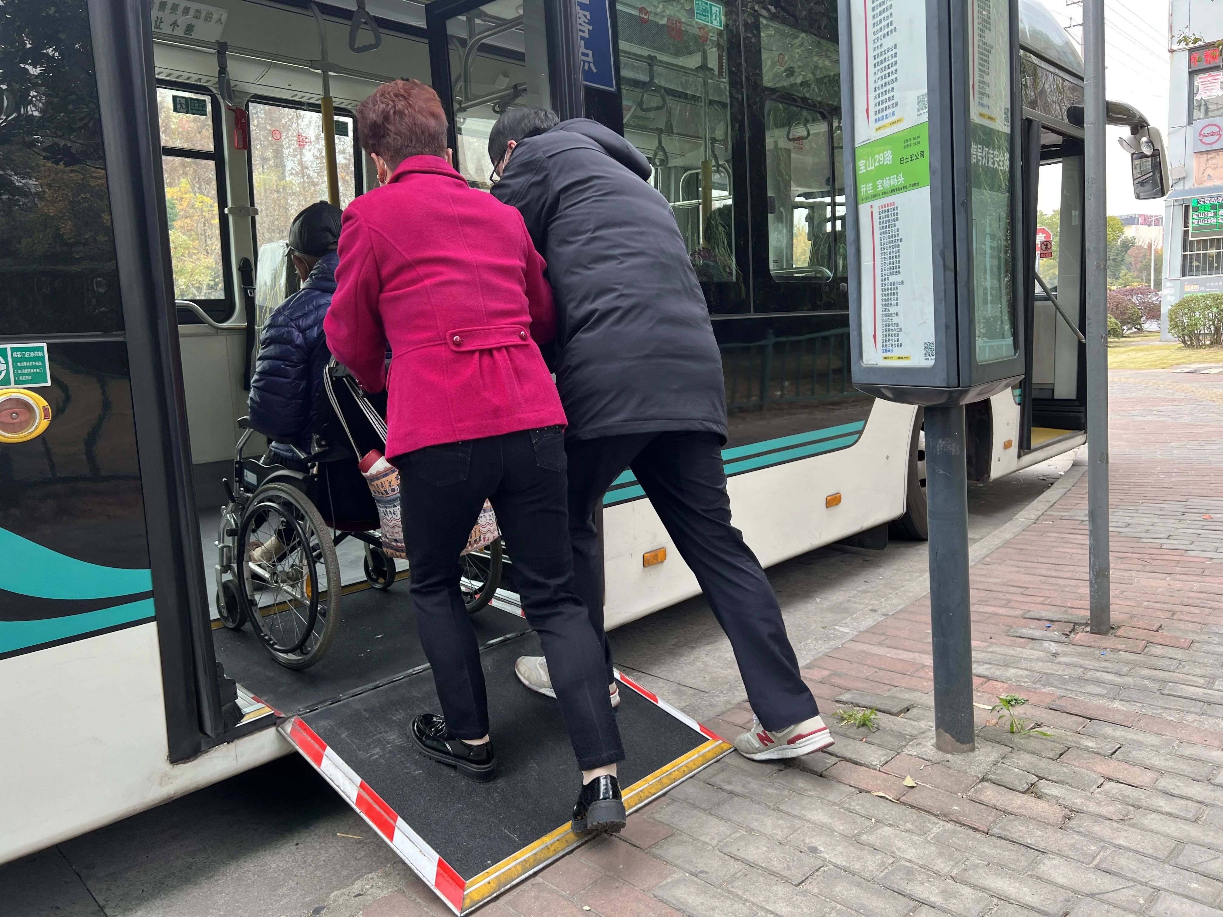 正为血透路发愁时,韩阿姨发现家门口的宝山29路可以直达医院门口,而且还配备了方便轮椅上下的伸缩踏板。尝试几次后,她和老伴发现,线路上的驾驶员个个都细心周到:“血透病人,浑身没有力气,我也弄不动他。驾驶员每次都下来帮忙、拉盖板,靠站停车特地挨着台阶方便推下轮椅,真的很感动。虽然只是一个小小的举动,对我们来说却是很大的帮助。”