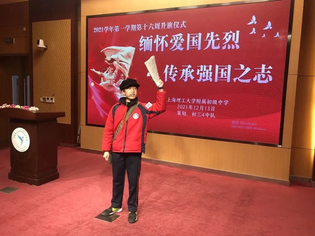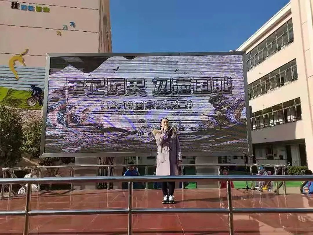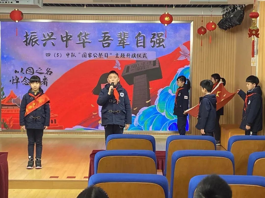 学校大队部举行“勿忘国耻,吾辈自强”的升旗仪式,四3中队的同学们带来了诗朗诵《国家公祭日感怀》,中队辅导员王老师为大家作了以《回望历史,敬畏生命》为主题的国旗下讲话。