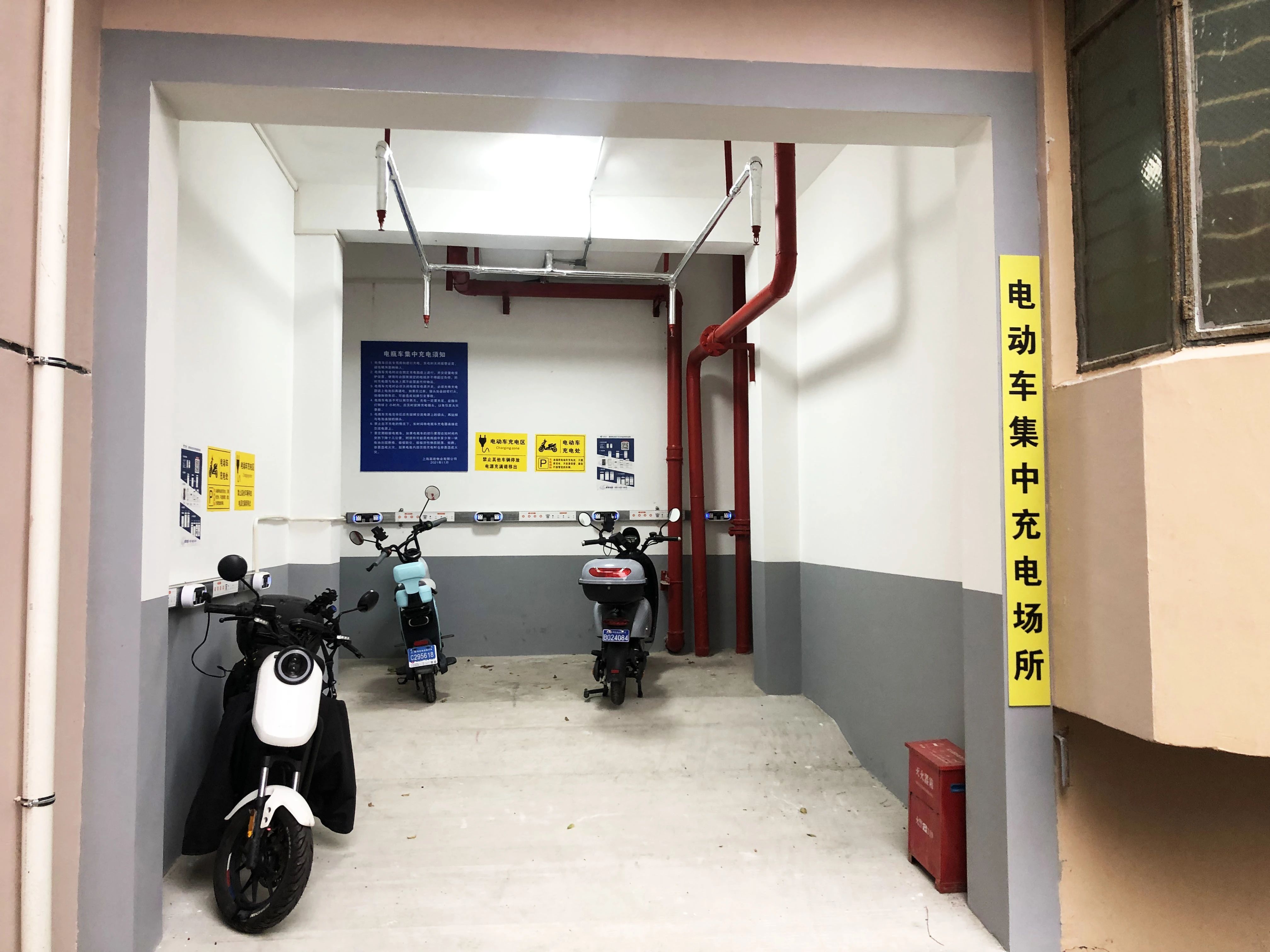 小区内有三处闲置垃圾投放存储空间,经过意见征询同意进行二次利用,在不改变原始结构的前提下增设智能充电和消防喷淋设施,实现小区三处集中充电空间改造提升,满足70辆非机动车错时充电,从根源消除飞线充电的安全隐患。