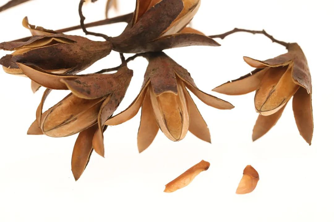 香椿果实的果皮开裂为5瓣,干燥的时候往外微微翘起,深裂至全长2/3左右。外表黑褐色,有细纹理,内表黄棕色,质感轻脆,手指稍稍用劲果实就会被扯断。再看里面的果轴,呈圆锥形,顶端钝尖,黄棕色,有5条棕褐色棱纹。如果用刀拦腰切断你会发现断面内心是松泡状,颜色是黄白色。