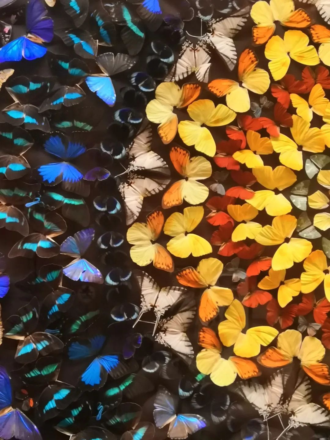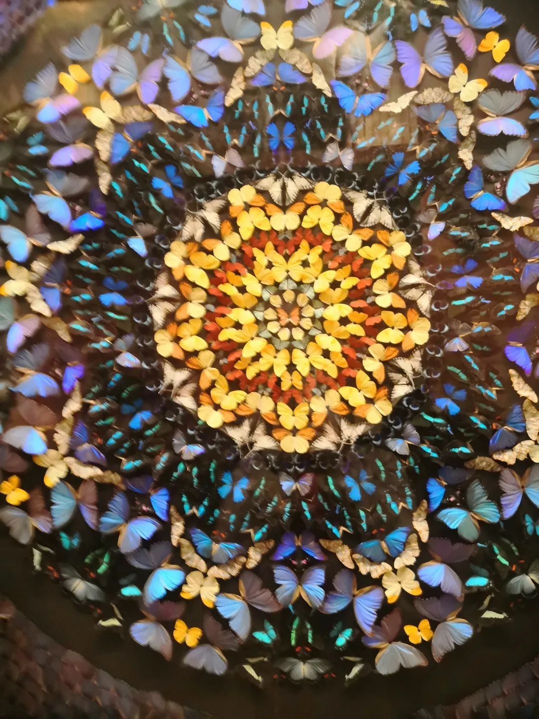 地下二层“缤纷生命”展区的蝴蝶墙,由1200只来自世界各地的蝴蝶翅膀拼贴而成。