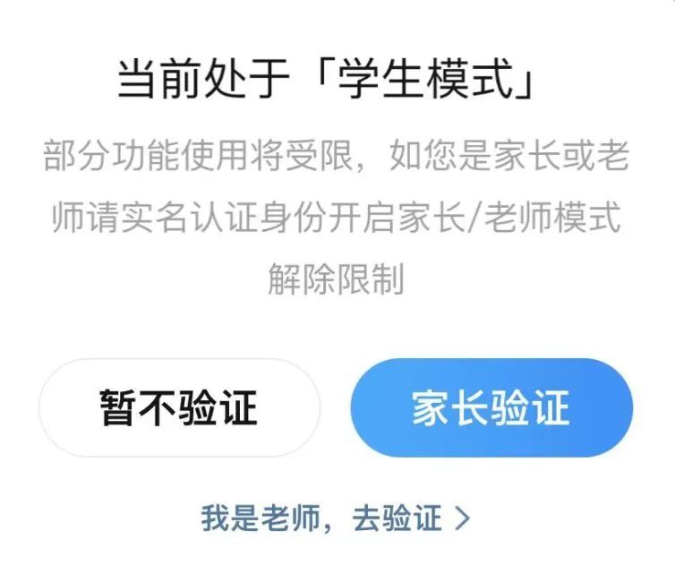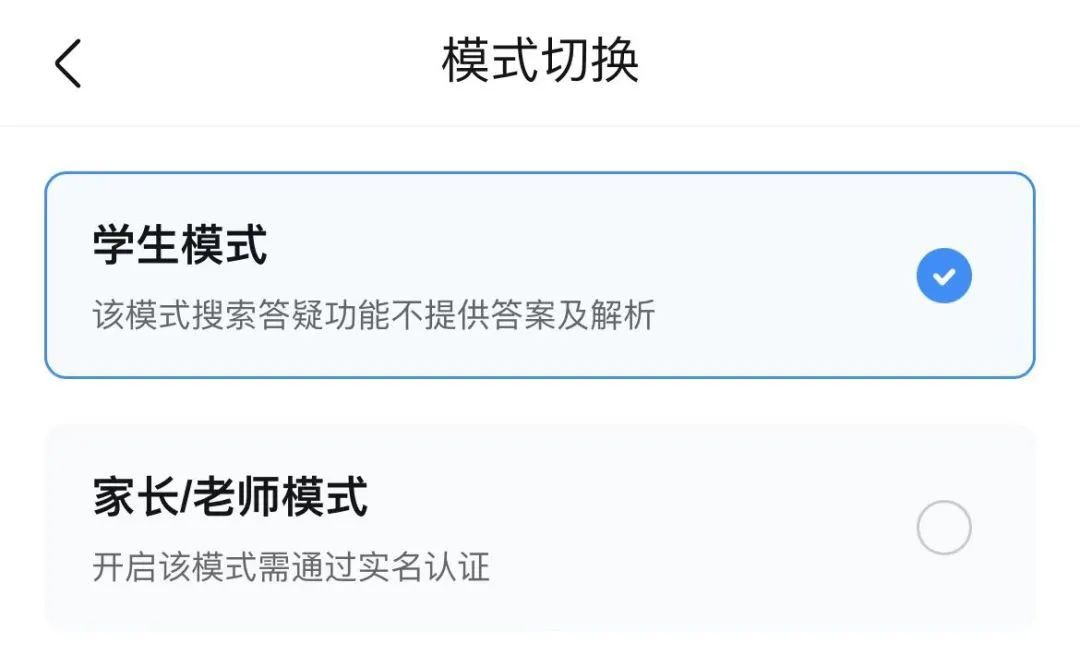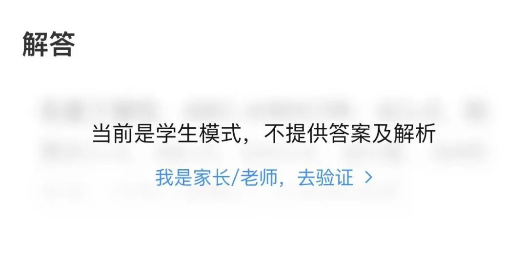 如果身份确定为“学生”,那么在拍照搜题后,解答部分便会出现提示:当前是学生模式,不提供答案及解析,需要老师或家长进行身份验证后才可查看。