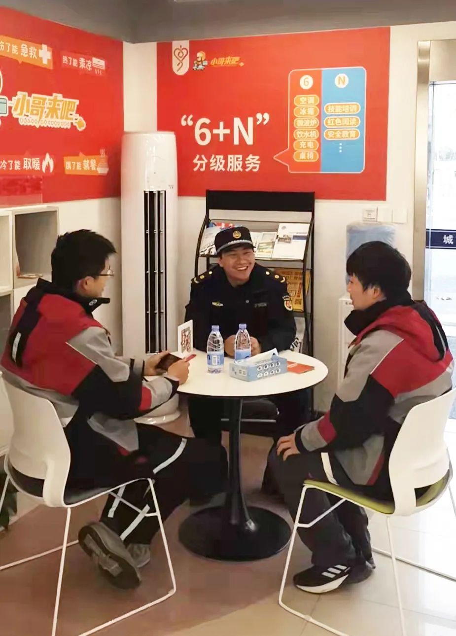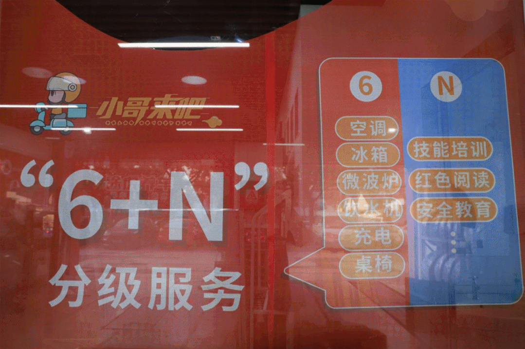 “小哥来吧”服务站是闵行区整合各类党群服务站点、资源及途虎养车、隆鑫物业等“两新”组织,为快递员、外卖员、网约工等新就业群体打造的“家门口”的服务站。全区推出150个“小哥来吧”服务站,为“小哥”提供涵盖“医、食、驻、行”的13项服务。各服务站的标准化配置是“6+N”服务包,有空调、冰箱、微波炉、饮水机、充电排插和桌椅,另外还可根据服务站实际情况,拓展更多服务内容。